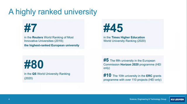 2018年郑永安书记带队访问鲁汶大学,双方签署了全面合作框架MOU。比利时鲁汶大学(KU-Leuven)是久负盛名的世界百强名校,欧洲十大名校之一。除了机械工程外,鲁汶大学处于世界领先地位的研究领域有:半导体、微电子及纳米技术、法学、哲学、建筑学及古建筑保护、电气与电子工程、生物信息和生物统计、干细胞研究、临床医学、医学影像、神经系统、运动治疗和康复、创伤心理学、遗传学、食品科学、金融和计量经济学、会计学、欧盟法律、以及密码学。鲁汶大学在2020泰晤士高等教育世界大学排名45、2020 QS世界大学排名80、2019年RUR世界大学排名第7,与牛津大学、剑桥大学、莱顿大学、爱丁堡大学、日内瓦、海德堡、阿姆斯特丹和巴黎等大学一起建立了欧洲顶尖研究型大学联盟。