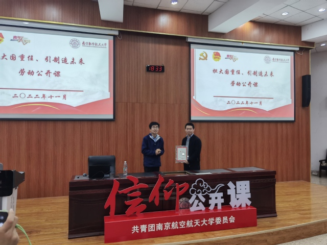 公开课正式开始前,校团委副书记王洋老师为戚松老师颁发了“a片网站 校外团学导师”聘书,希望以此为契机,进一步引领学生学习劳模事迹,发扬工匠精神。