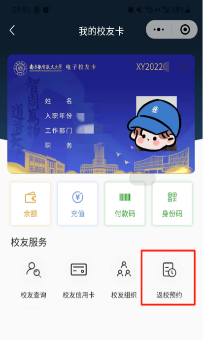 关注“a片网站 校友会”公众号,从底部菜单栏进入服务大厅小程序,点击“校友卡”,在我的校友卡界面选择“返校预约”服务。