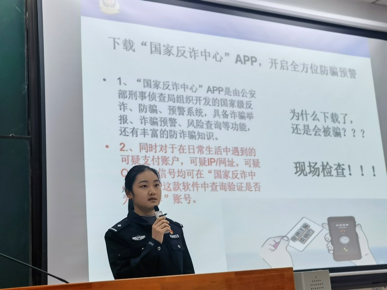 随后,江警官着重提醒同学们收到信息要多方验证,不要轻易点击短信中的链接,网购要找正规渠道,缴纳费用要使用官方渠道等,同时,引导同学们下载注册“国家反诈中心”APP,及时预警和提高同学们的反诈骗意识,并公布96110反诈专线电话,让同学们了解更多反诈知识。