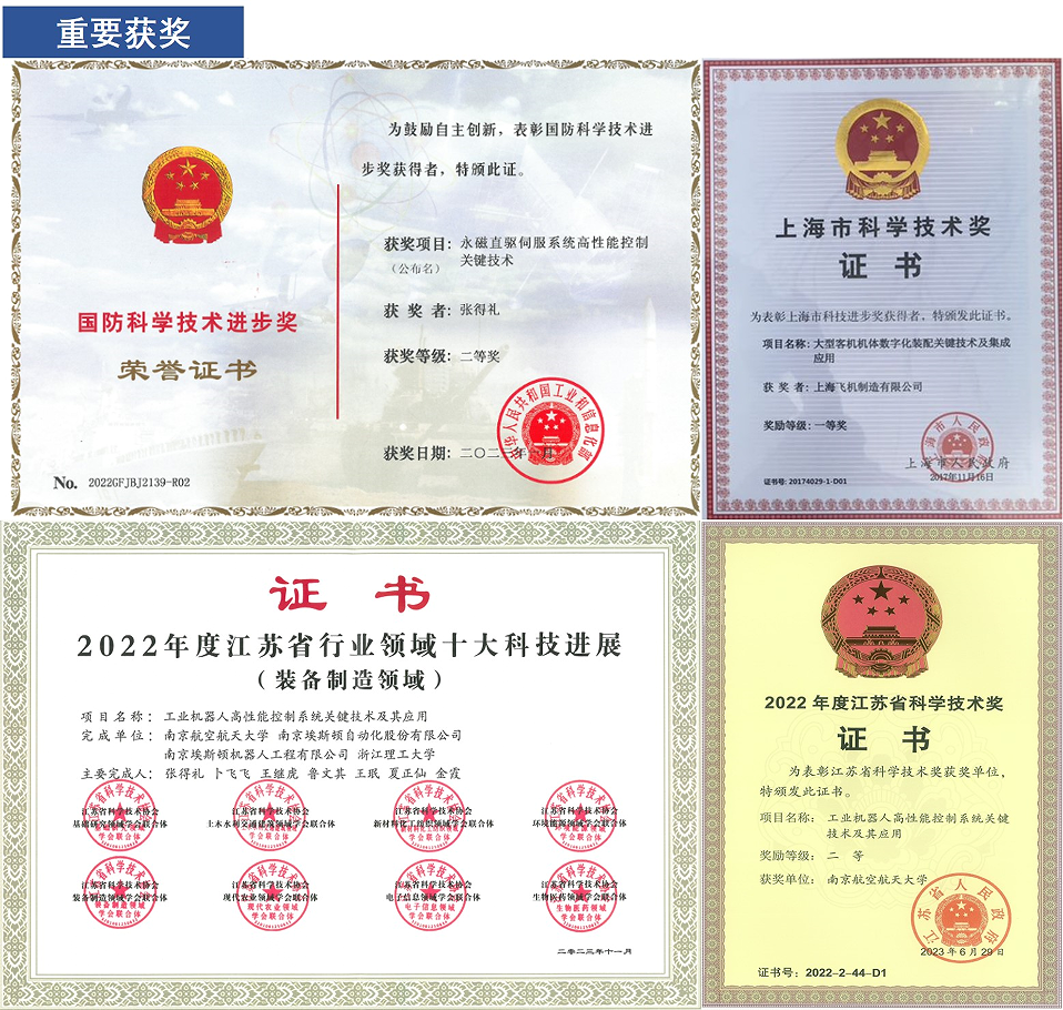 在科学研究方面,团队瞄准科学前沿问题和国家发展重大需求,将科学研究和产业创新、实践教育有机结合,主持国家重点研发计划、国家自然科学基金、工信部民机专项等重大或重要科研项目,突破了飞机复合材料装配形性一体化控制技术、工业机器人高精度-高柔顺-高安全控制关键技术、永磁直驱伺服系统高精度控制技术、大齿槽转矩补偿技术、力伺服控制技术等。研制出3大国内首套在役的重要航空航天装备;为空间站提供2大关键功能部件;研制出多套型号产品样机。相关科研成果和研制的成套装备打破了西方的垄断,为我国重大战略计划实施、重大型号工程研制、行业“卡脖子”技术突破提供了有力的技术支撑。获得国防科技进步一等奖、二等奖及江苏省科学技术奖二等奖,成果获得江苏省行业领域十大科技进展。