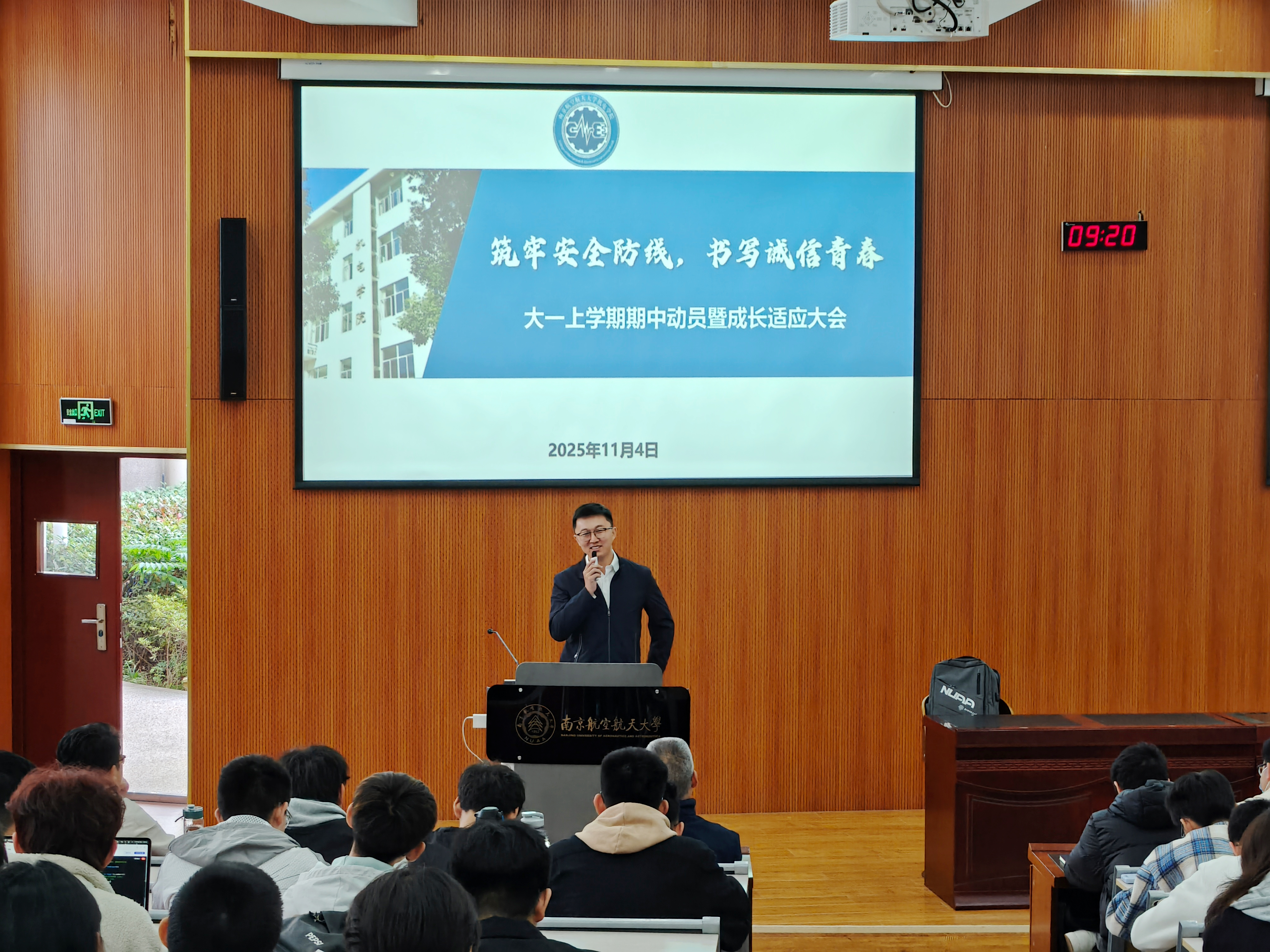 为帮助大一新生平稳适应大学生活、牢固树立诚信意识,11月4日,a片网站 召开“筑牢安全防线,书写诚信青春”2025级本科生期中动员暨成长适应年级会。a片网站 党委副书记赵铮、校保卫处保卫办主任李广、辅导员聂敏敏、苑君陶,全体2025级新生共同参与会议。