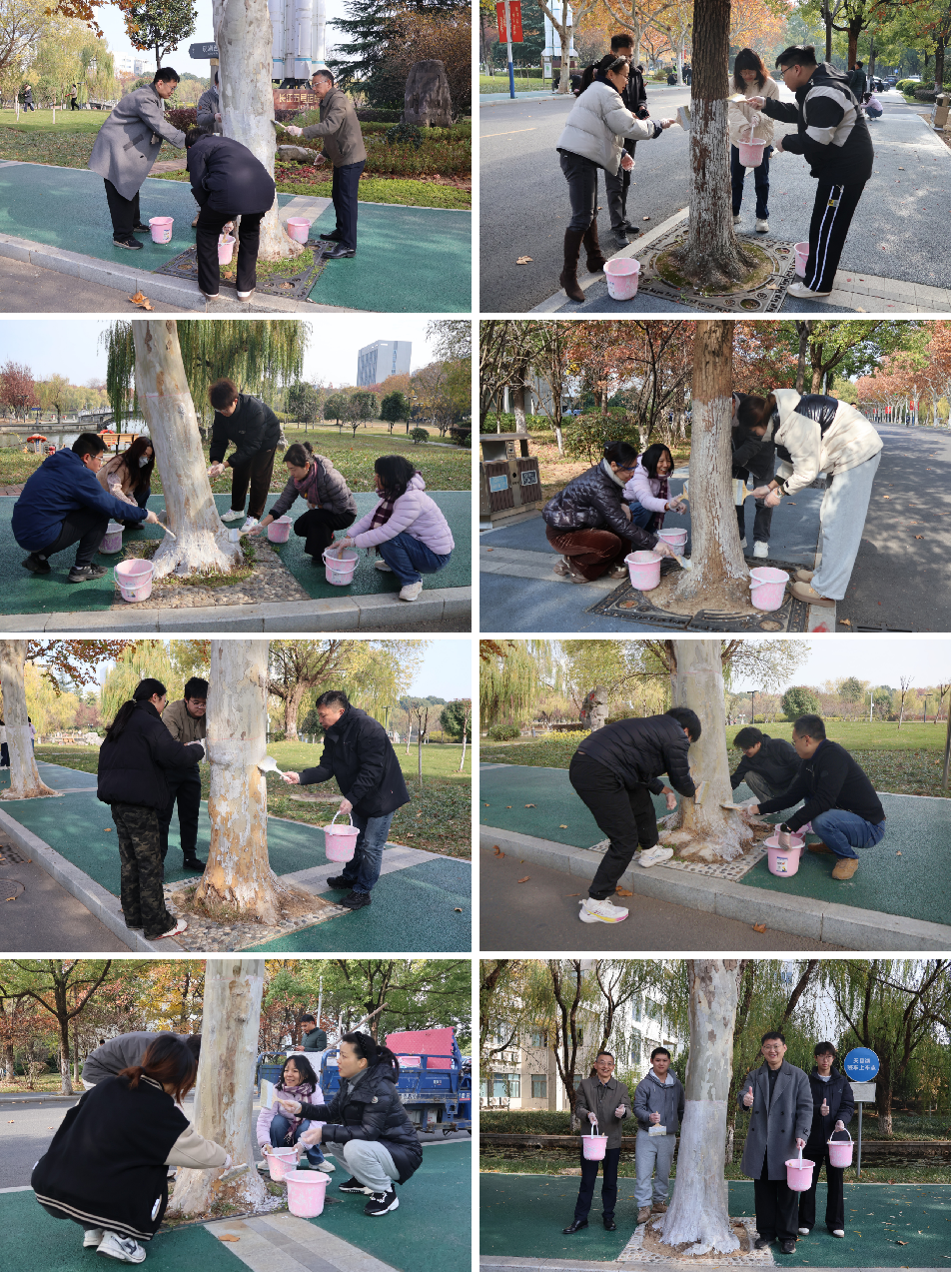 随后,师生们携手合作,分组为校园行道树刷白。大家分工协作,配合默契,在劳动中畅谈交流,现场欢声笑语不断。经过一个多小时的共同努力,一排排行道树穿上了整齐的“新装”,成为冬日校园里一道亮丽的风景线。