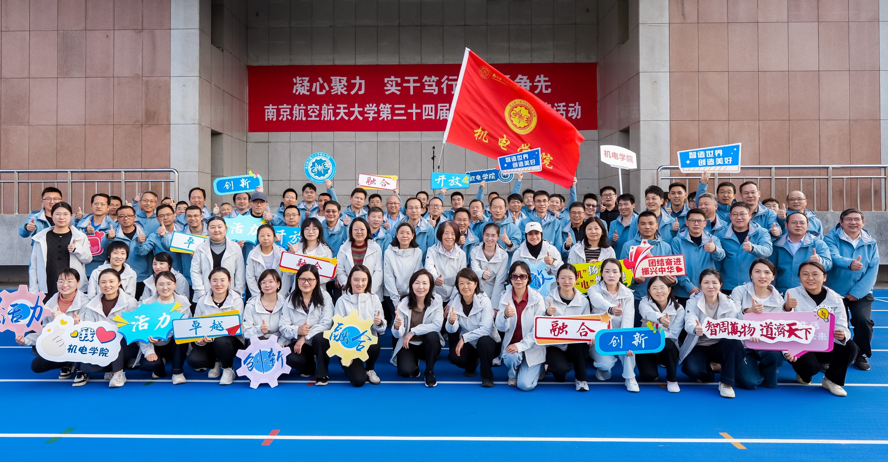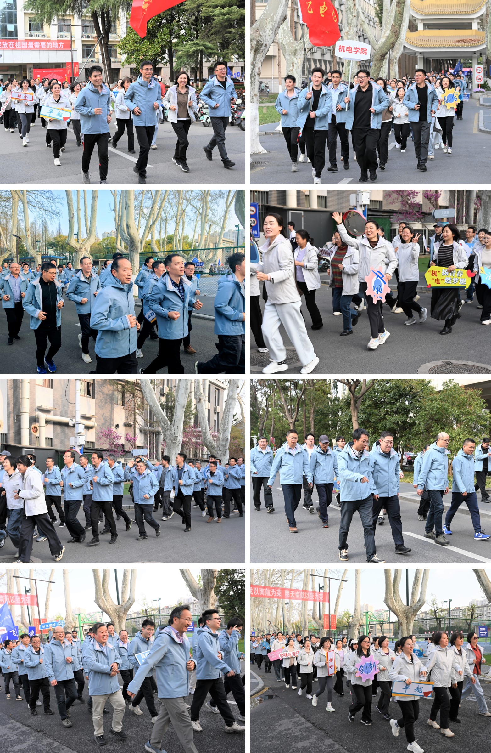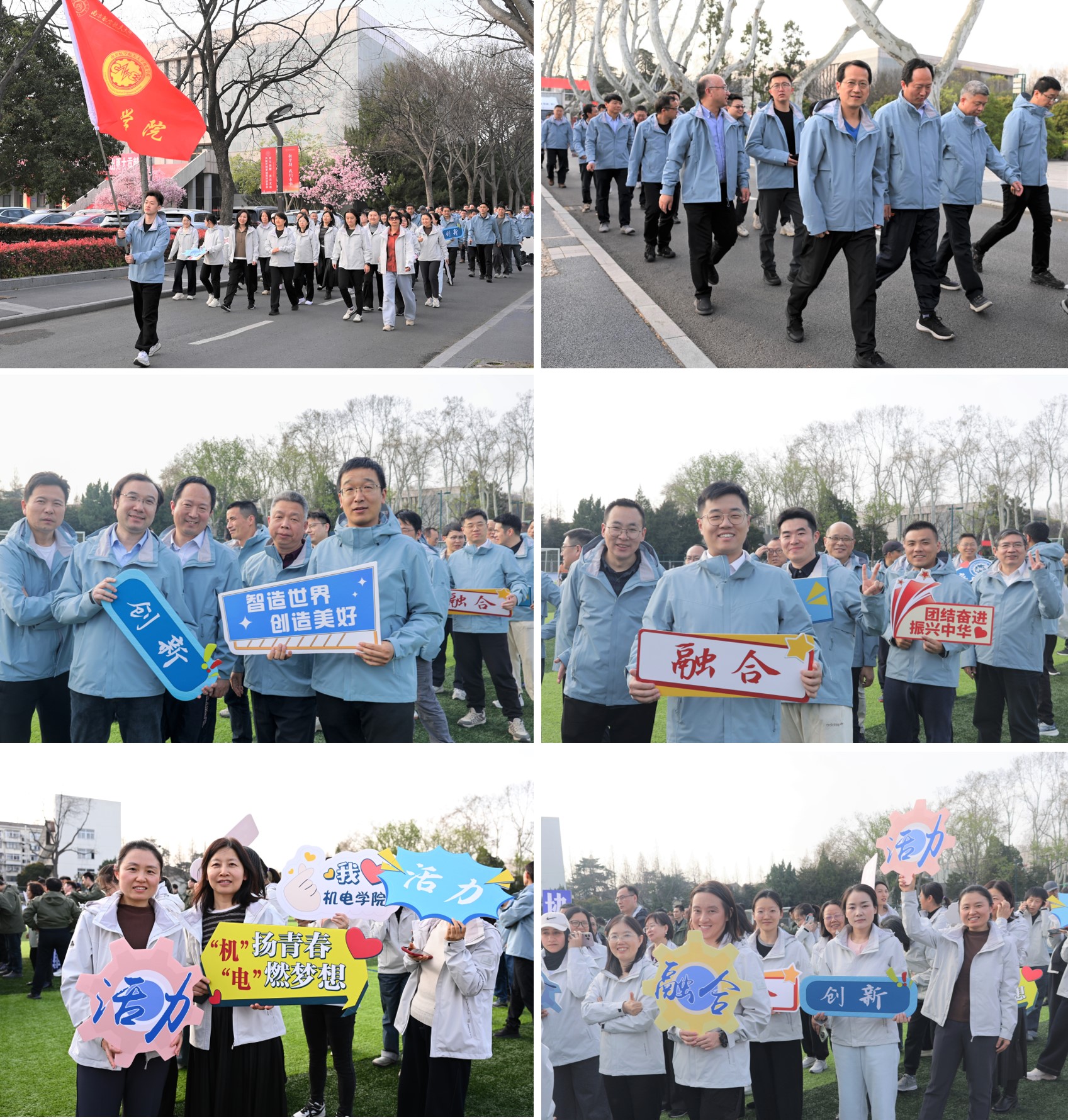 教职工们齐聚学院楼下,身着统一着装、手持宣传标语,迎着和煦春风,整齐列队前往操场集合。大家精神饱满、意气风发,认真进行热身准备,脸上洋溢着幸福灿烂的笑容,尽显学院教职工健康向上、乐观积极的良好风采。