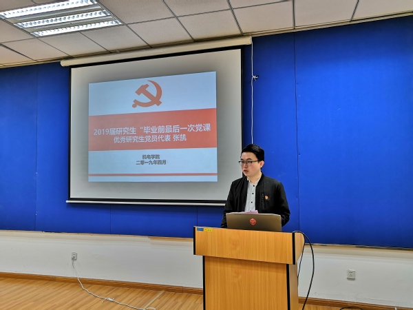 在聆听完丁秀东老师的讲座后,2019届毕业生党员代表张凯同学分享了自己的感受,他表示在这最后的南航时光里有幸聆听了最后一次党课,深受触动。他回顾了自己在南航九年的求学经历,并代表毕业生党员庄严承诺,在今后的岗位中会不忘初心,牢记宗旨,进一步增强“身份意识、学习意识、建功意识、感恩意识”,以“智周万物、道济天下的情怀,以团结、简朴、唯实、创新的精神不断勉励自己,以不懈的努力证明自己无愧于母校的悉心培养,用实际的行动为母校争光添彩。”