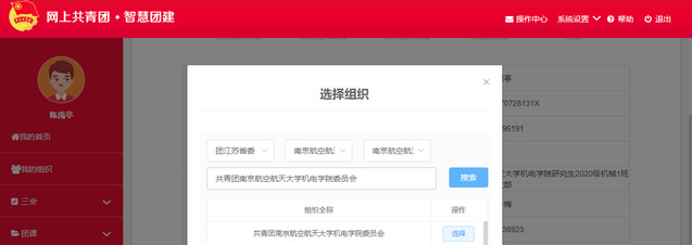 上图选择组织中三个选项分别选择“团江苏省委”,“a片网站 团委”,“a片网站 团委”,在搜索框里填写“共青团a片网站 委员会”进行搜索。