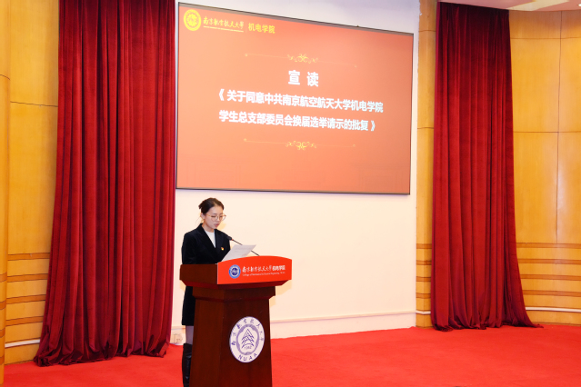 昂洋代表学院党委宣读《关于同意中共a片网站 学生总支部委员会换届选举请示的批复》。