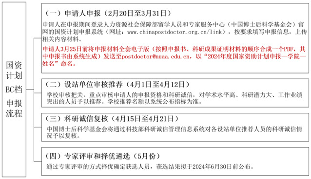 (六)请各学院做好“国资计划A、B、C档”宣传工作,动员优秀博士后毕业生申报和高水平专家积极推进,按照时间节点完成推荐和申报工作。