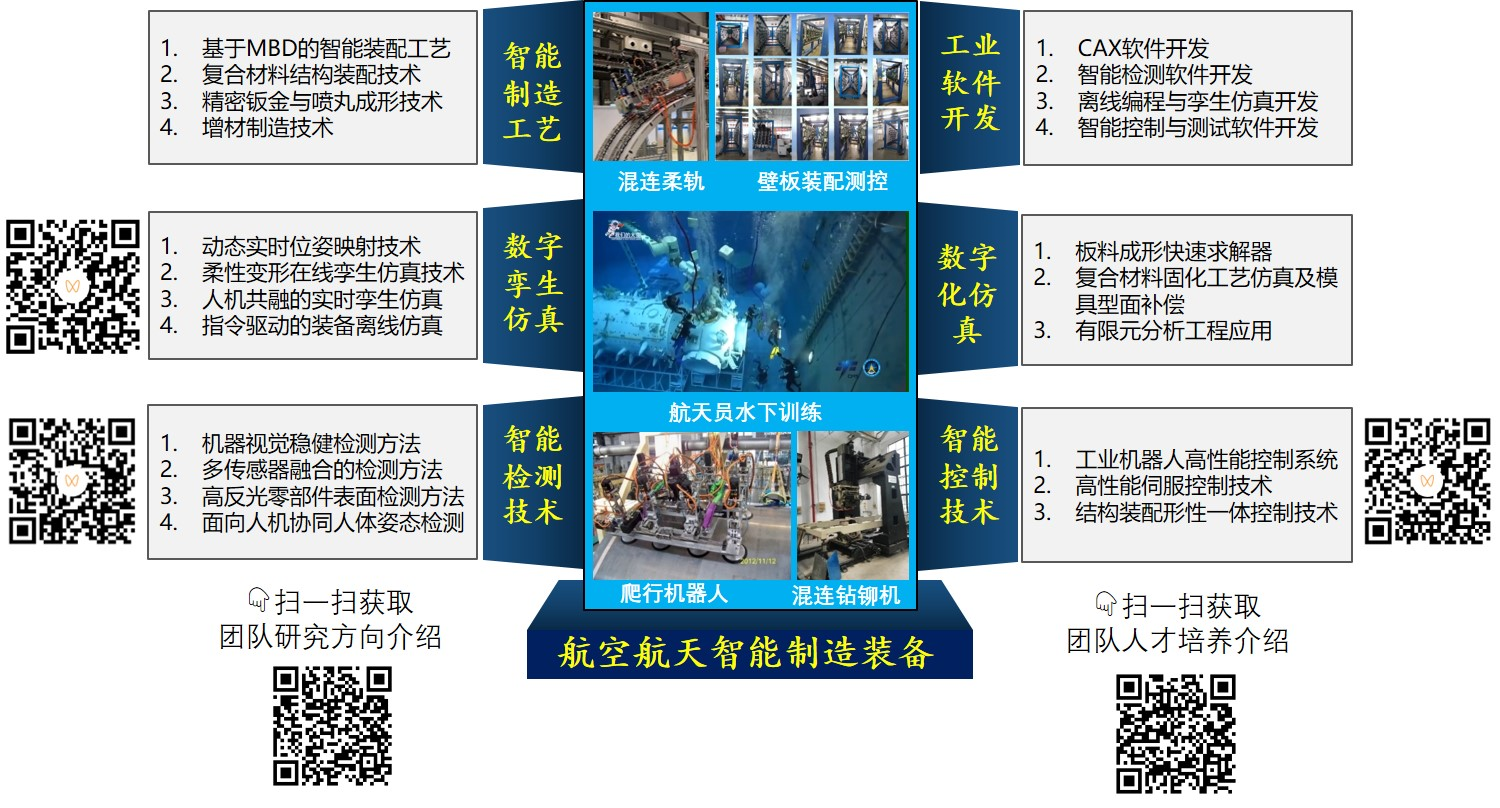 团队依托国家级重点学科、国家级重点实验室以及多个省部级重点实验室和工程中心为平台,以国家航空航天重大需求为牵引,研究其中关键科学技术问题,开发创新技术和方法,研制自主可控航空航天制造装备。以智能制造工艺为牵引,以智能检测和智能控制技术为手段,以智能制造装备和软件为表现,实现材料加工工程、机械电子、自动控制工程等学科同航空宇航科学与技术学科的交叉融合发展。
