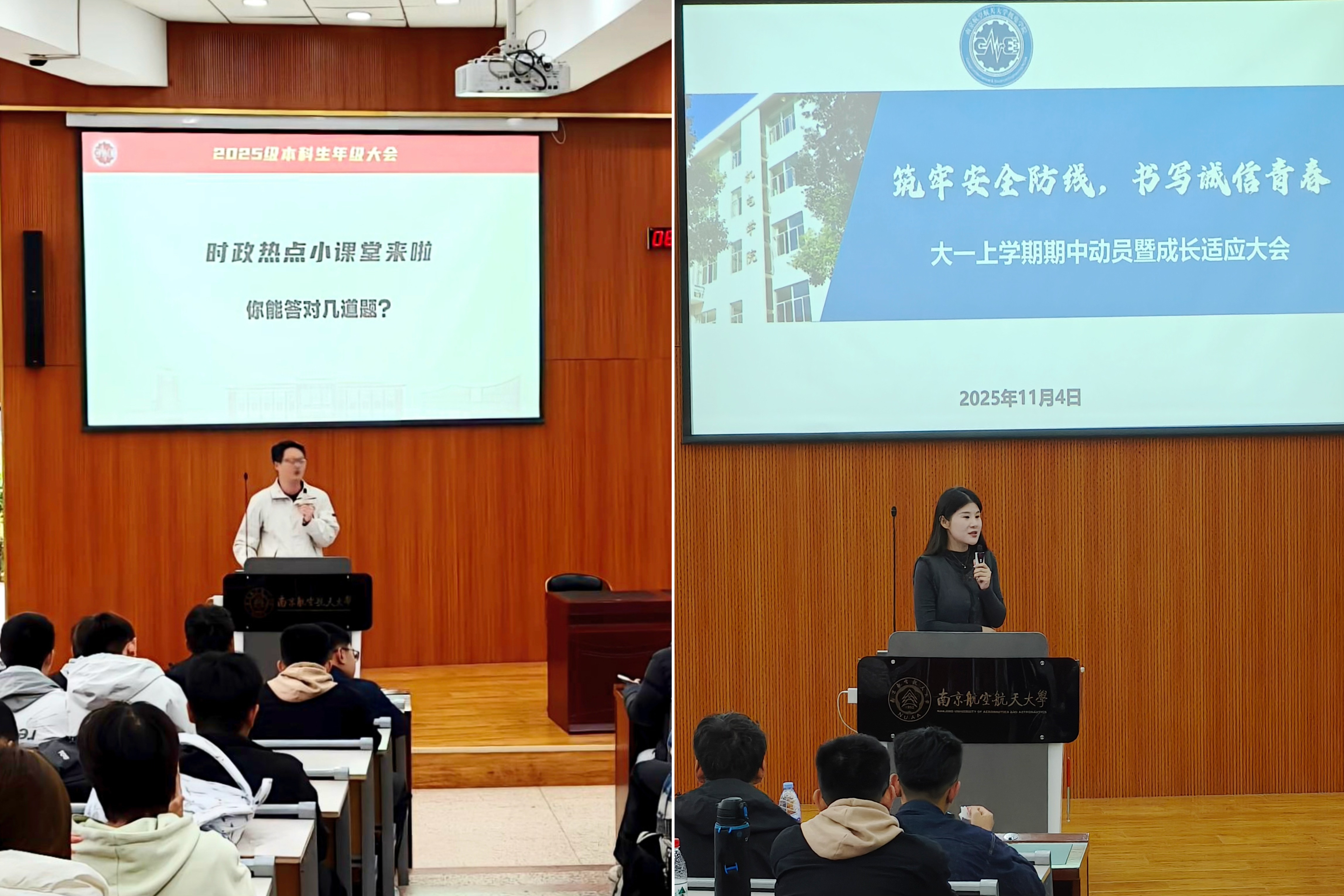 为帮助大一新生平稳适应大学生活、牢固树立诚信意识,11月4日,a片网站 召开“筑牢安全防线,书写诚信青春”2025级本科生期中动员暨成长适应年级会。a片网站 党委副书记赵铮、校保卫处保卫办主任李广、辅导员聂敏敏、苑君陶,全体2025级新生共同参与会议。