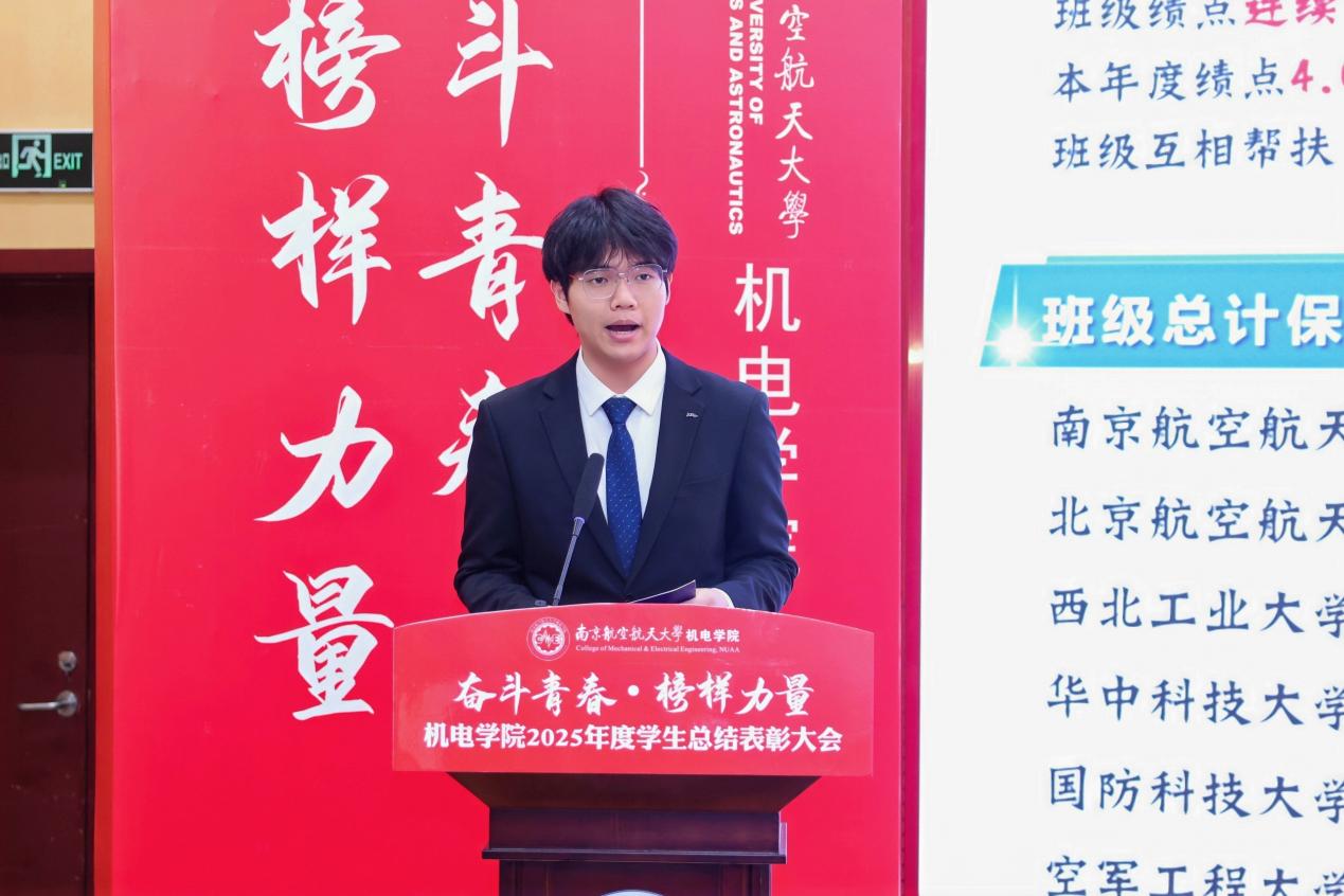 校长特别嘉奖获得者、2022级本科生吴洛以“打磨·啮合·载荷·装配”四个机械专业关键词串联起他的大学成长轨迹,讲述了从学业精进、科创攻坚到学生工作与社会服务的全面历练,展现了南航学子扎实的专业功底与全面的综合素质。